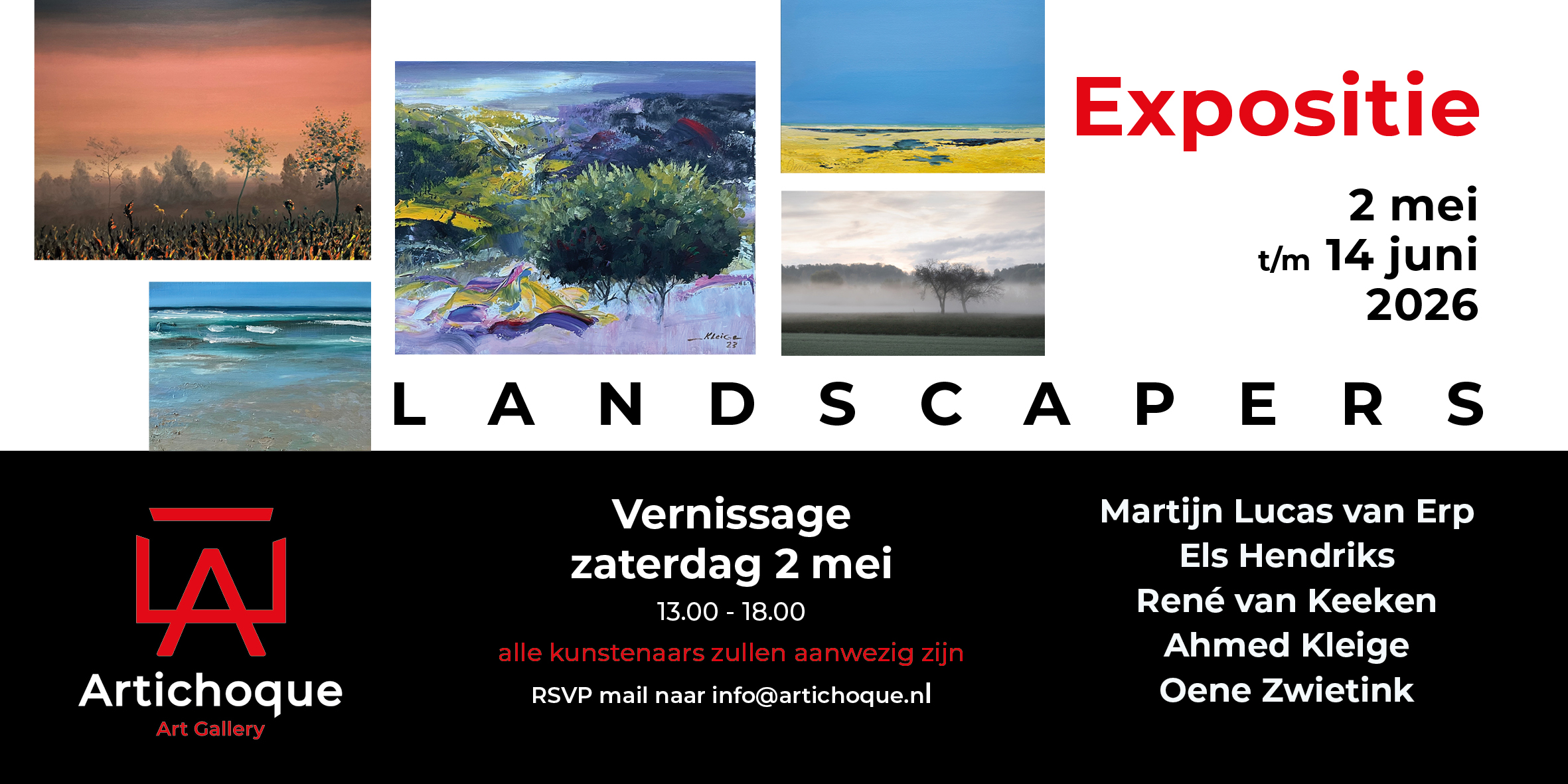 Vijf kunstenaars tonen ieder hun persoonlijke blik op het landschap – van verstild en ingetogen tot expressief en kleurrijk, uitgevoerd in diverse technieken zoals fotografie, acrylverf en olieverf. Samen vormen de werken een veelzijdige en levendige ode aan het landschap.